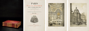 提要:是书红色摩洛哥羊皮精装,烫金轧花;内含整页巨幅雕凹线腐蚀版画100幅,特种美术纸精印,均出自法国一流版画家之手,包括Philippe Benoist,Arnout,Bayot,Ciceri,Gaildreau,Fichot,Sabatier等等,展现了法兰西800年的昔日荣光,包括遗迹、景观和历史场景,文字描述由法国大文豪、中短篇小说大师普罗斯佩·梅里美(1803-1870),及法国哥特复兴建筑的中心人物、建筑师与理论家、画家维欧勒·勒·杜克(1814-1897)等人执笔,被认为是巴黎浪漫主义作品的巅峰之作。展现了卢浮宫、凯旋门、巴黎圣母院、杜伊勒里宫(现已不存)、大皇宫、卢森堡宫、议会大厦、帝国军事学院、爱丽舍宫、法兰西学院、圣礼拜堂、圣日耳曼、玛德莲教堂、蒙梭公园、圣丹尼斯凯旋门、皇家广场、市政厅、克吕尼博物馆、巴黎植物园等历史遗迹,以及攻陷巴士底狱、拿破仑登基等重要历史事件。题材难得,存世较少。