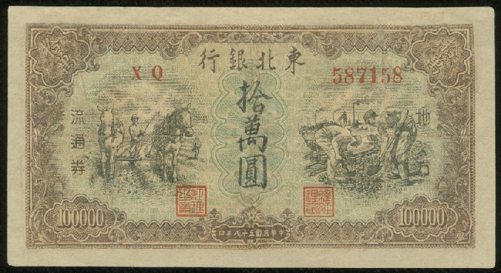 东北银行拍卖价格 17年12月31日 编辑 上海泓盛拍卖 取消关注 关注 私信 拍卖信息: 拍品信息: 东北银行,拾万圆,民国三十八年(1949年),近八成新。 所属拍卖会:2017秋季拍卖会 所属专场:似水流年-中国纸币专场 lot:1938 更多东北银行图片: