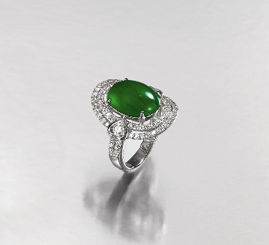 著录 : 红k金镶嵌翡翠钻石戒指,拱形素面满绿翡翠,翠色阳艳、匀称、质地细腻,配镶心形及圆形钻石,翡翠尺寸约为长度14mm及宽度10.5mm,戒指圈直径为17.5mm。