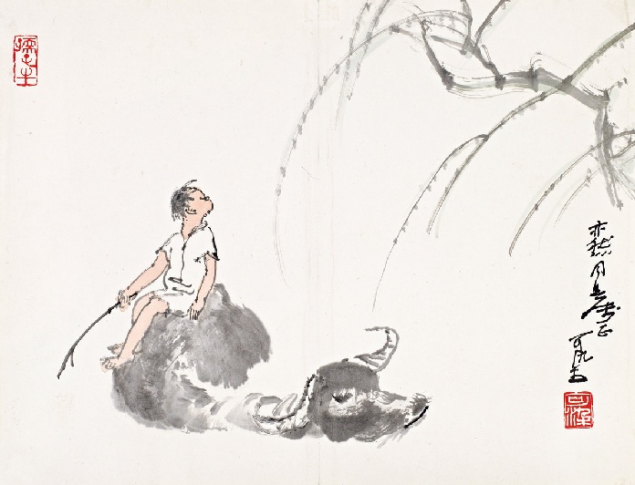 说明:《牧牛图》中,牧童正持树枝驱牛渡河,河边柳树抽出新芽,枝条轻扬,牧童扭身回首张望。水牛的身躯一半没入水中,恣纵的笔墨表现牛的体格筋骨,形象准确,近水处略以湿笔,虽不着一笔于水,却觉河水荡漾。画面质朴天真,抒发出田园牧歌式的情调,如古诗中“牧童归去横牛背,短笛无腔信口吹”的意境。