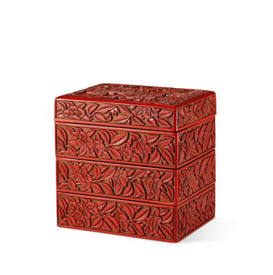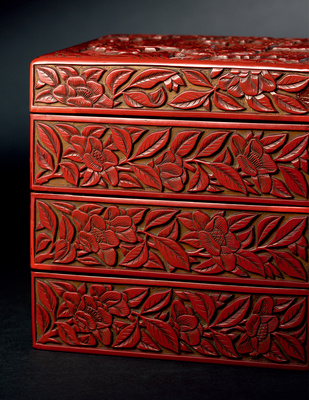 剔红为中国漆器工艺之一,以木或金属为胎,上髹数十至百余层厚漆,待髹漆半干时雕琢花纹。剔红技法成熟于宋元时期,有明一朝达到鼎盛。此三层盒髹漆厚润坚重,朱色红艳悦目,雕工灵活多变,纹饰布局层次分明,漆之横切面层纹清楚利落,于人物花卉处生动,于锦地边框处精细如丝,构图和意趣为典型明代风格。