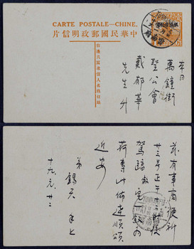 拍品描述 : 1930年帆船1分限滇邮资片云南府寄本市,中法文标头名姓版片,销云南府1月22日英汉三格日戳,背落1月24日到戳,双戳清,保存完好