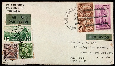 : 贴帆船邮票13分、孙中山像邮票2分及航三邮票15分各一枚,销上海9月6日戳,有北平9月12日中转戳,封右上予贴美国邮票1分半二枚、3分一枚,销北平美国大使馆海军陆战队派遣军9月14日戳,极为少见,此封左上有上海至北平航空英文指示,为国内航空邮件再交美军寄往美国,此种邮路少见,封品相完美