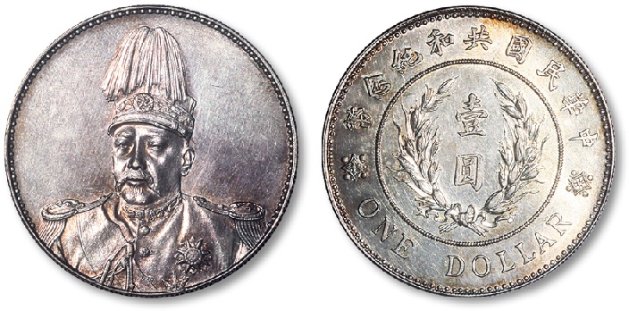 1914年袁世凯戎装像中华民国共和纪念币一元银币一枚,人像打制清晰精美,底板细腻光洁,光泽柔和内蕴,状态极佳,完全未使用品