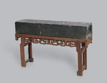 拍品描述 : 琴桌下为柏木拐子龙纹装饰木架托,其上为汉代空心砖,河南地区产,又称郭公砖,古人发现以空心砖架琴,在抚琴时可产生共鸣,琴声悠扬,清音回荡,故以此作琴桌。