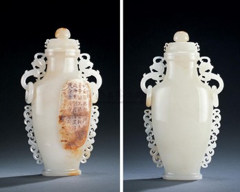 拍品描述 : 此器为整块玉料制成,玉质洁白温润,器身为扁形,以盖、壶部分组成,盖为圆扭,颈两侧镂雕螭龙耳并套以活环,瓶两侧自盖至底透雕纹饰。瓶身素面不做任何雕琢,仅一面腹部桂花皮上刻御题诗。此双耳瓶线条秀美流畅,雕刻精细,刀工明快准确,与器物浑然一体,显示了精巧完美的构思和工艺。此白玉瓶器物雕工讲究,实为案头赏玩之佳器。