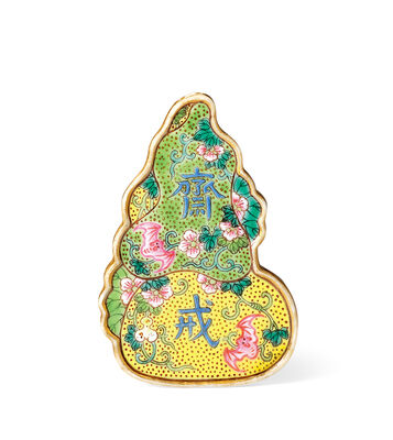 : 齋戒牌,呈束腰葫蘆形,雙面分繪一大一小、黃綠雙色葫蘆,邊緣葫蘆藤枝伸展,其間粉色葫蘆花相互爭艷,另有四隻粉色蝙蝠飛舞其間,寓意「福祿雙至,賜福萬代」。牌正中以藍彩書滿、漢二體「齋戒」,字體工整,色彩鮮明,極富韻味和宮廷氣息。齋戒牌為清代宮廷齋戒大禮之佩帶用器,有長方、橢圓或海棠等式樣,種類豐富,素以其小器精作而受到人們喜愛。