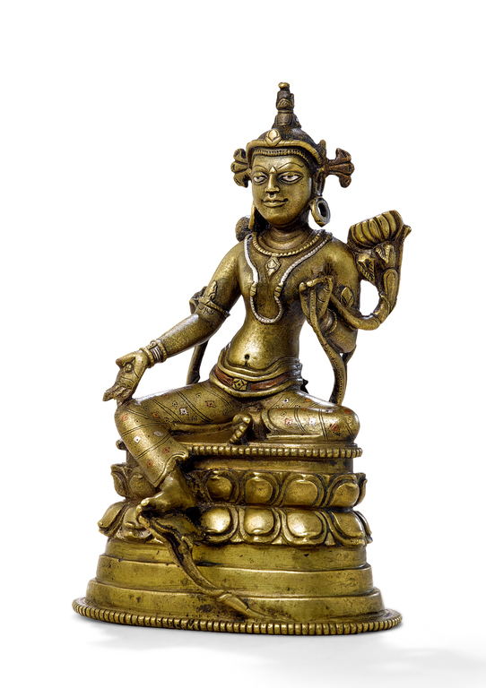 : 度母自在坐,右手伸展于膝施与愿印,左手以大拇指及无名指轻捻一茎蓝莲花于胸前。头戴三叶宝冠,冠叶窄小,发髻高耸,宝珠顶严。余发挽成一球状发髻偏于右肩。度母面部具有东北印度造像的形象特点,双眼、璎珞、手钏、腰带、以及长裙纹饰都有细腻的银或红铜镶嵌。造像形体较为硬朗,背面塑造略为扁平,应为西藏模仿东北印度造像所制。然而此时的西藏造像,仍为纯粹模仿帕拉风格,还未形成独立的艺术特色,因此年份可能较早。不论材质还是工艺,此件造像应为同时期西藏仿帕拉风格造像中的精品之作。