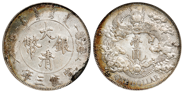 说明:宣统三年大清银币壹圆一枚,Y-31/LM-37,双面边缘带状彩色氧化,GBCA AU55